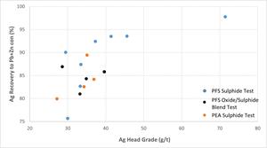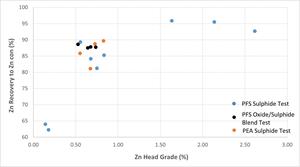 Oxide-sulphide blends: four locked cycle tests of oxide-sulphide blends (~10% oxides / ~90% sulphides) returned implied average recoveries for oxide mineralization through flotation of approximately 60% for Ag, 40% for Pb and 85% for Zn. These recoveries can most likely be attributed to the presence of sulphide mineralization (galena and sphalerite) in the oxide layer as identified by preliminary mineralogical analysis.