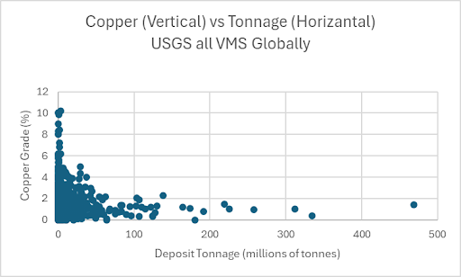 The database is sourced from the United States Geological Survey (Mosier, Berger, and Singer, 2009) to represent all the world's volcanogenic massive sulphide deposits. These are one of several types of deposits that deserve consideration. I have started with only one type of deposit to simplify the exercise. In addition, I clean the data in the following ways. I drop all deposits that have missing grade and tonnage numbers, which is 233 data points. Additionally, 14 deposits are missing grade numbers.