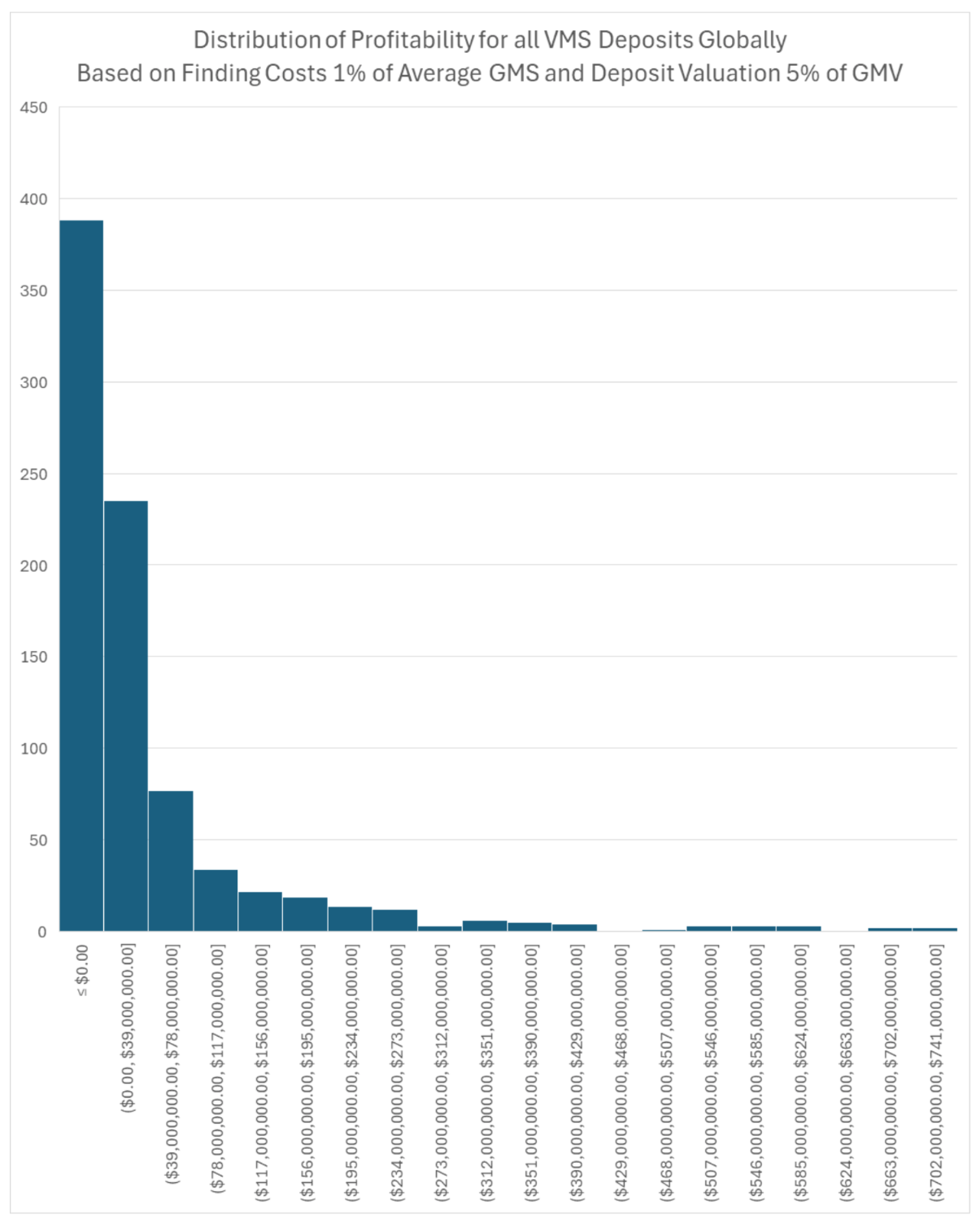 The distribution of the profitability for all deposits shows several important features. For one, many deposits have a negative economic return. Additionally, a few deposits have extremely high returns. These two features echo how the mining exploration business is characterized by losers, except for the few large winners who provide enough appeal to draw speculators into the entire business endeavour.