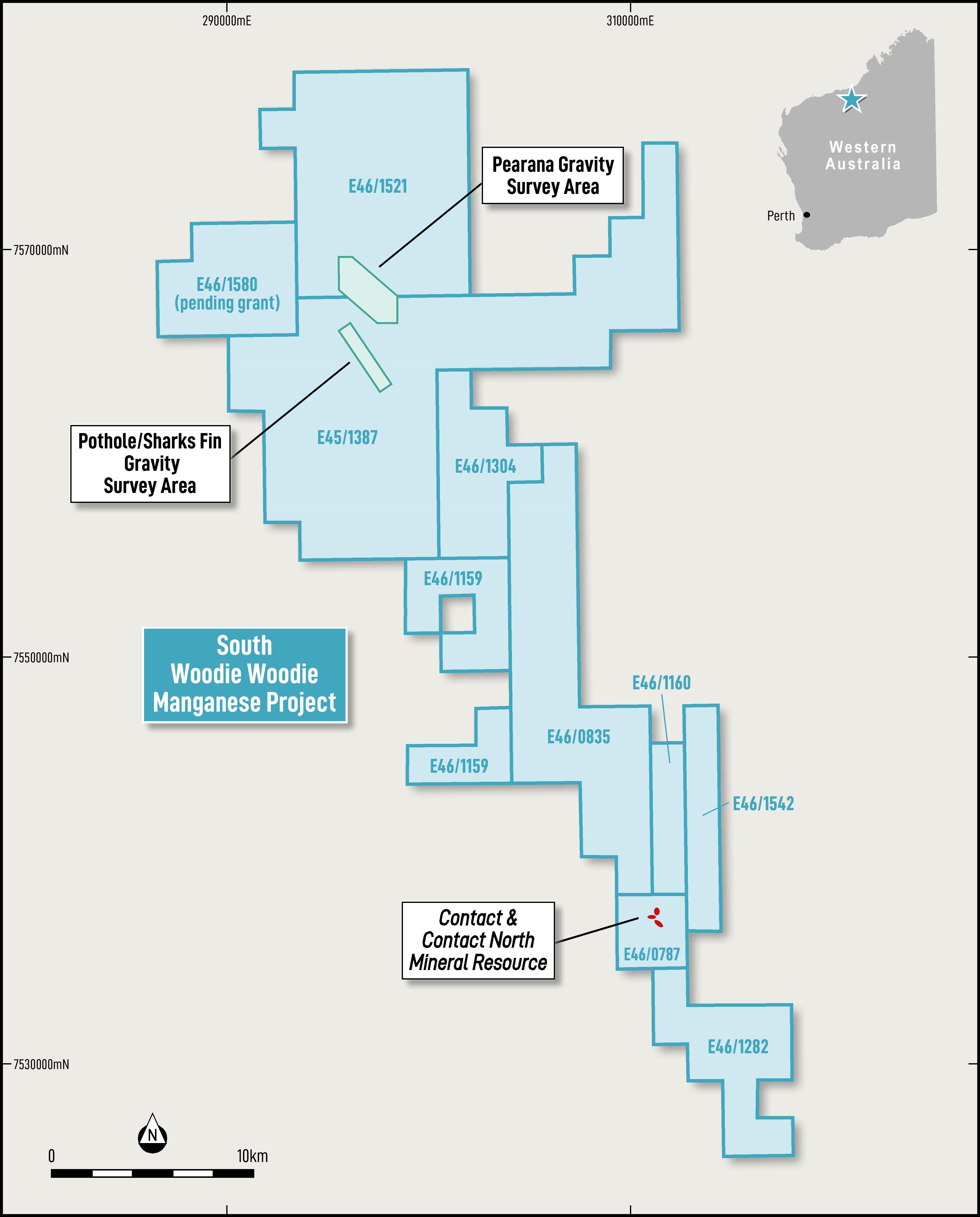 Figure 1. AEF's South Woodie Woodie Exploration Licenses and locations of Contact mineral resource and planned gravity survey covering the Pearana, Pothole and Sharks Fin manganese targets
