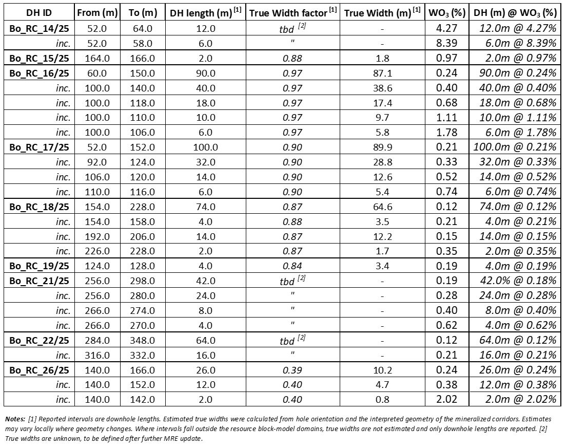 Bo_RC_18 and Bo_RC_19 targeted the transition "gap" central zone between the central-south high-grade backbone and the recently discovered north-dipping large medium-grade lode, an area historically interpreted as lower grade. Results exceeded current MRE expectations, returning grades above the deposit average and strengthening the geological bridge between two high-grade domains. This continuity is expected to be an important factor in resource growth and future mine design.