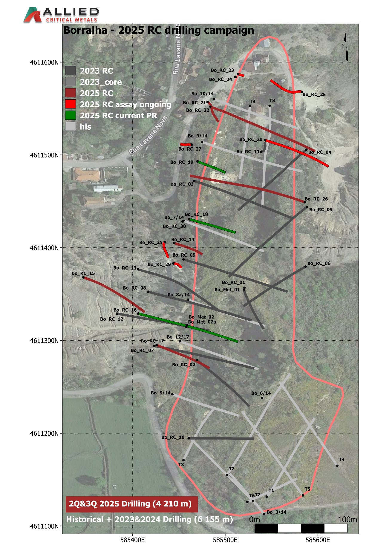 Figure 1 - Drill collar plan showing planned holes for the completed 4,210 m RC campaign at the Borralha Project. The red outline delineates the main mineralized breccia zone.
