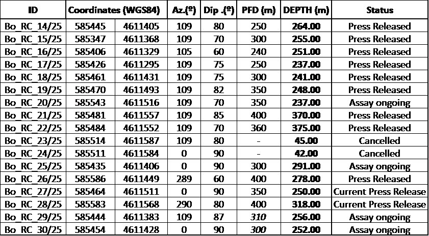 The results from holes Bo_RC_27/25 and Bo_RC_28/25 confirm strong mineralization continuity in the northwestern dip area of the Santa Helena Breccia (SHB), extending the recently discovered high-grade North dip backbone toward the north and west and reinforcing previous Mineral Resource Estimate (MRE) indications.