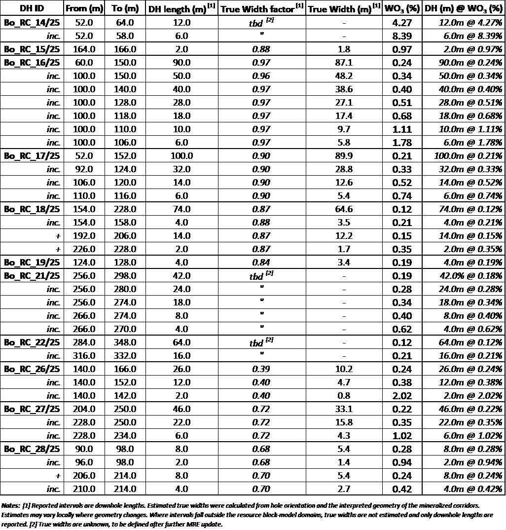 Drill hole Bo_RC_27/25 intersected a thick zone of disseminated wolframite mineralization along the northwestern structural dip of the SHB, corresponding to a domain where the 2024 MRE had identified only moderate-grade envelopes.