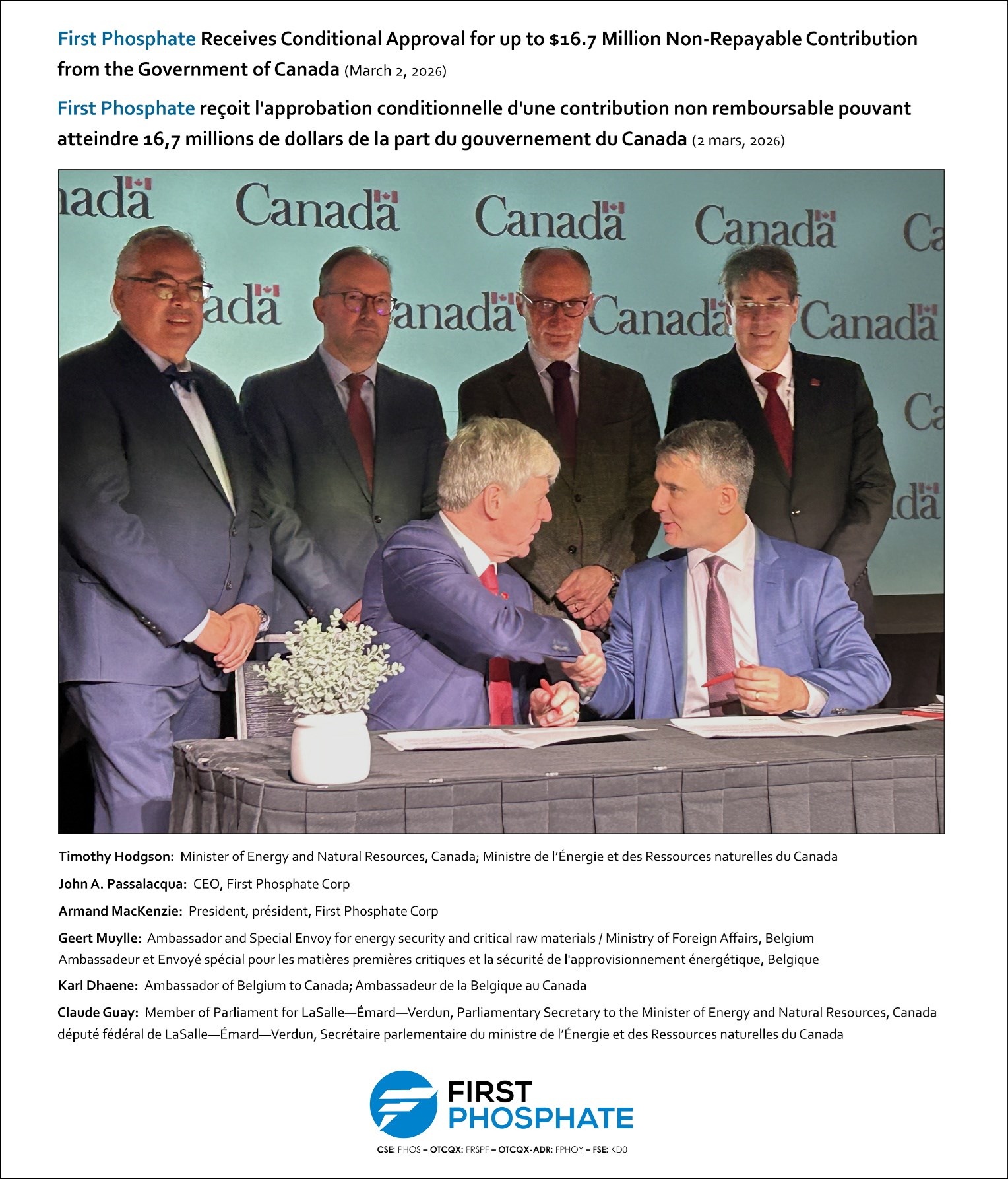 « Le Canada et ses partenaires investissent des capitaux réels dans les chaînes d'approvisionnement en minéraux essentiels sûres et résilientes dont dépendent nos économies et nos industries de défense », a déclaré l'honorable Tim Hodgson, ministre de l'Énergie et des Ressources naturelles. « En soutenant des entreprises comme First Phosphate, nous contribuons à fournir les minéraux dont le monde a besoin et à assurer la prospérité et la sécurité que méritent les Canadiens. »