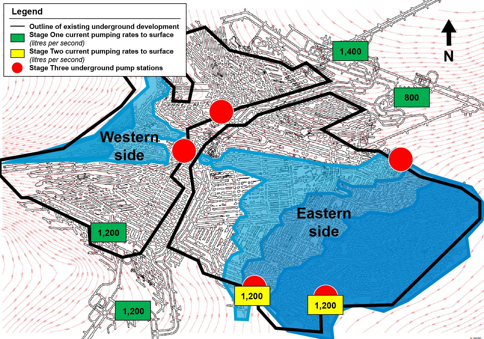 - To date, approximately 13 kilometres of lateral development have been rehabilitated. As the water level declines, the mining crews are primarily focused on rehabilitating the access drives required to reposition the Stage One underground pumping infrastructure, as well as the access to the Stage Three pump stations, which are currently submerged. The mining crews expect to start gaining access to the existing Stage Three pumping infrastructure in November.