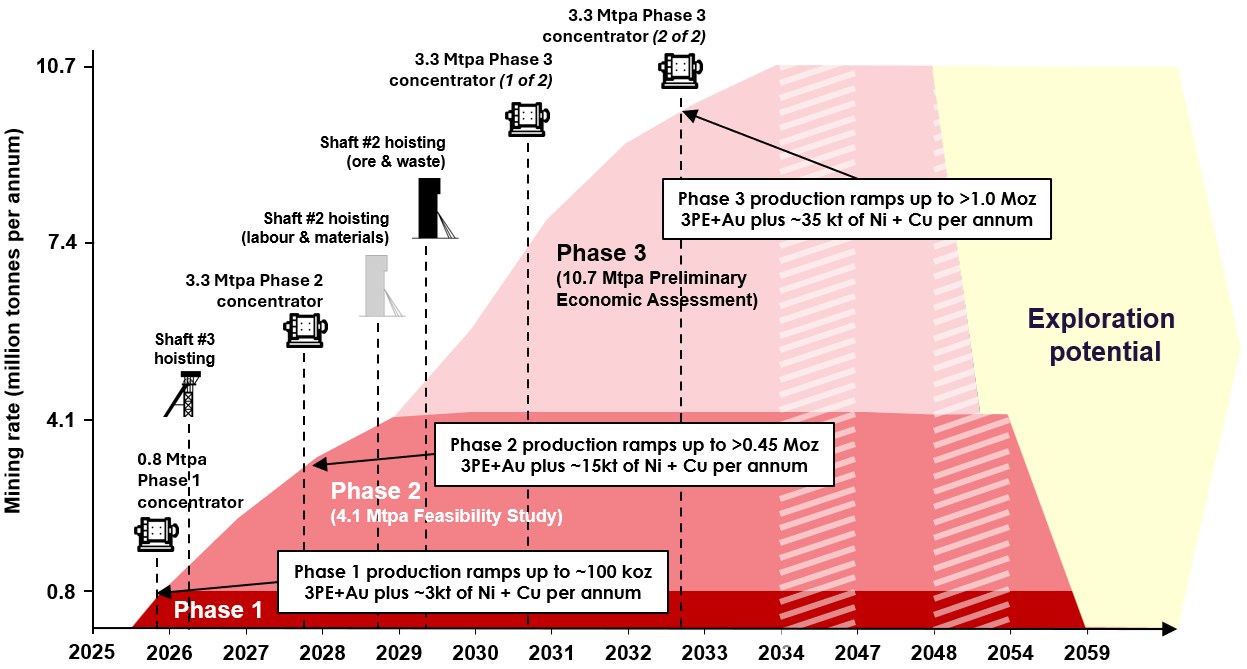 - Platreef's project team has already commenced work on the development of Phase 2, targeting first production in Q4 2027. Phase 2 production is expected to be more than four times larger than Phase 1, producing approximately 450,000 ounces of platinum, palladium, rhodium, and gold (3PE + Au), plus approximately 9,000 tonnes of nickel and 6,000 tonnes of copper from Q4 2027.