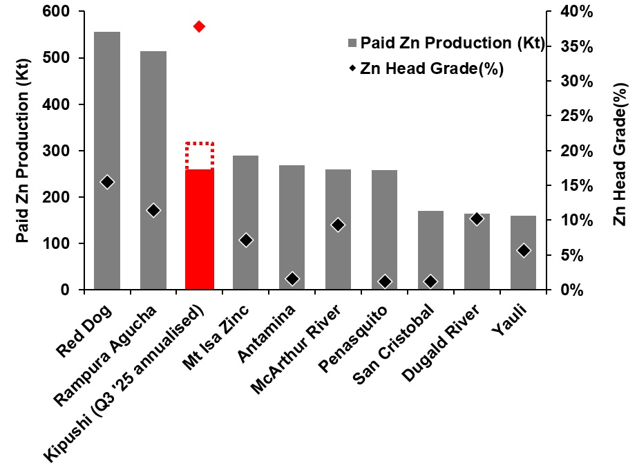 Kipushi produced a record 57,200 tonnes of zinc in Q3 2026; reaching annualized production rates of up to 315,000 tonnes of zinc in concentrate