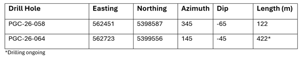 Fig. 1 - Crippleback Zone Drill Holes PGC-26-058 and PGC-26-064