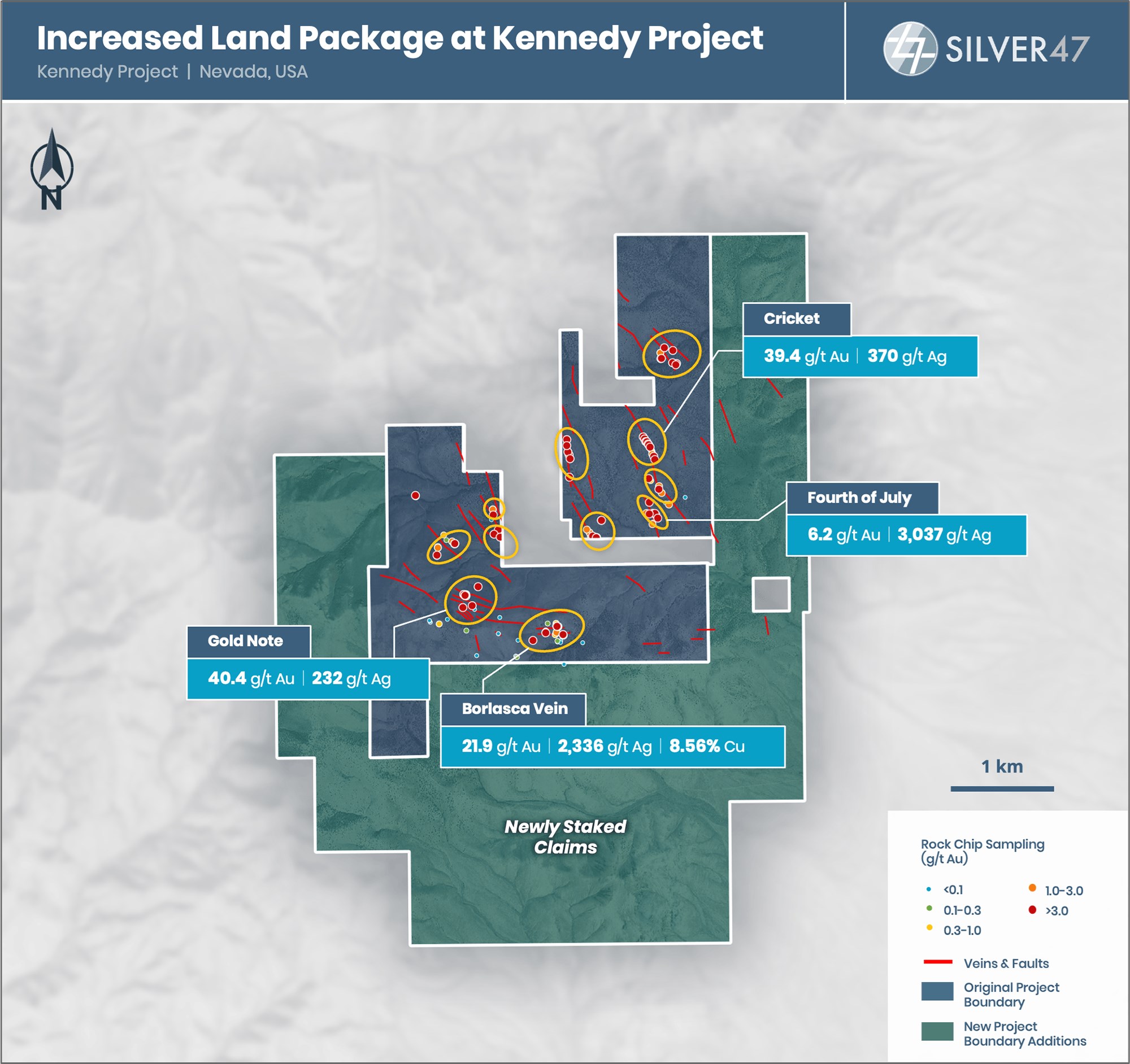 Major Expansion in Nevada's Kennedy District: Silver47 has tripled the size of the Kennedy Project to 6,150 acres by staking approximately 4,150 additional acres and consolidating substantial ground in this underexplored historic gold-silver district.