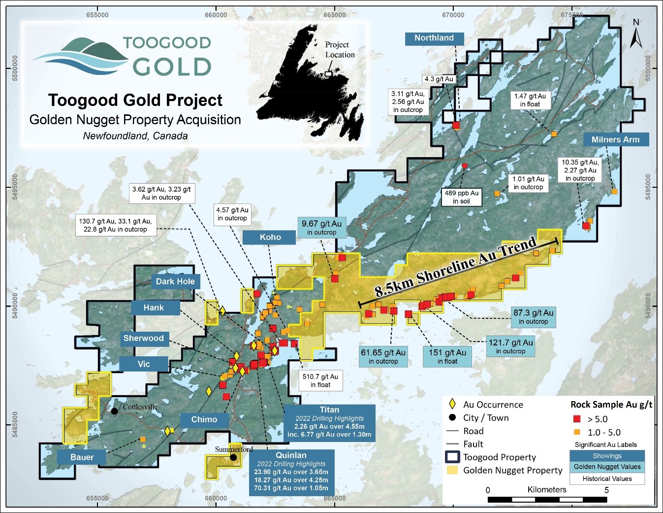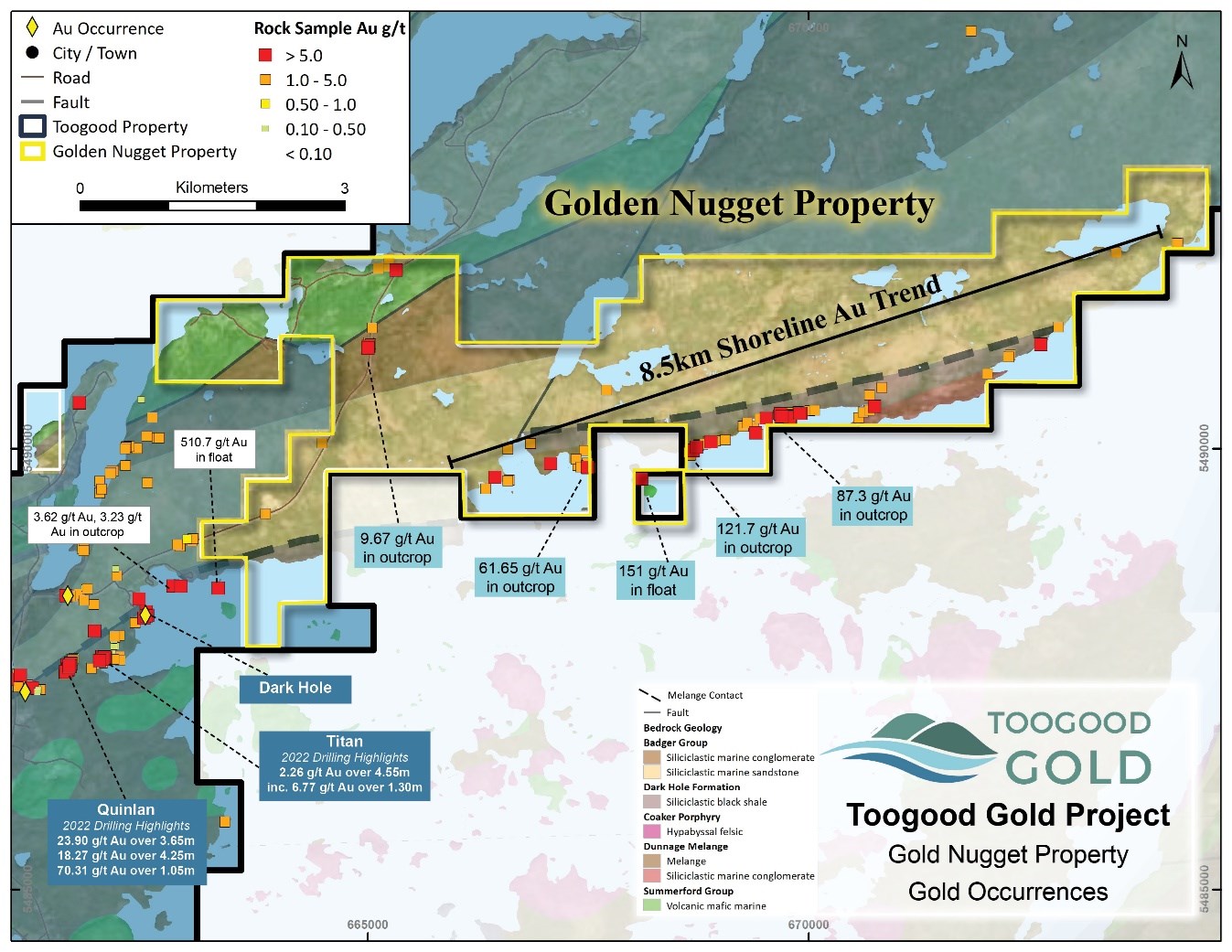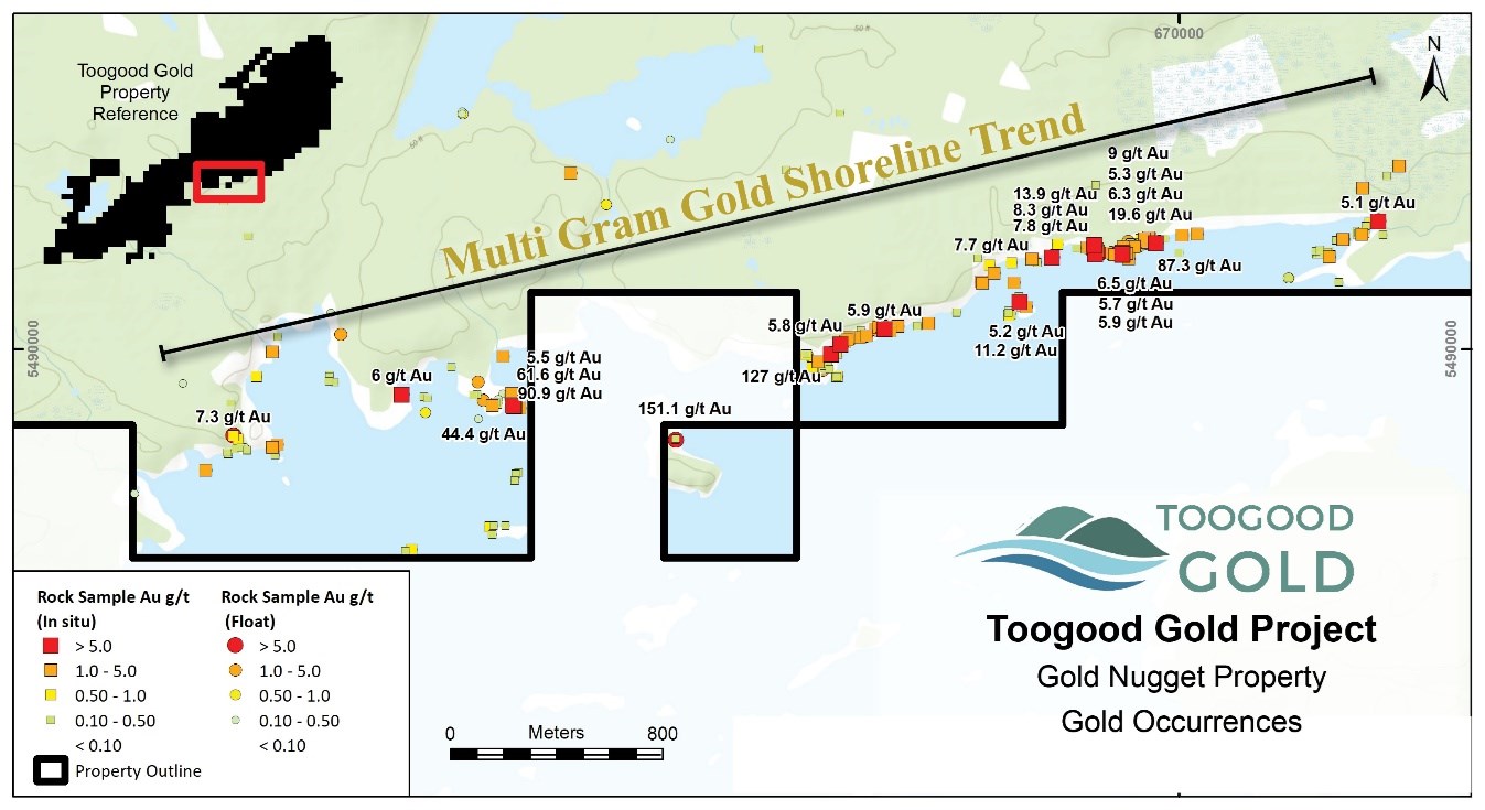 "The Golden Nugget acquisition represents a compelling opportunity for Toogood, adding 3000 hectares and >12 kilometers of highly prospective strike along a highly underexplored, fertile gold trend," said Colin Smith, CEO of Toogood Gold Corp. "Of particular significance is the 8.5-kilometer-long stretch of coastline where historical rock sampling consistently returned high- to bonanza-grade gold directly from outcrop. It is extremely rare to see such a continuous, high-grade trend at surface that is devoid of extensive modern-day exploration. We look forward to launching our October rock sampling and mapping program to validate these exceptional results, and lay the groundwork for potential future drilling."