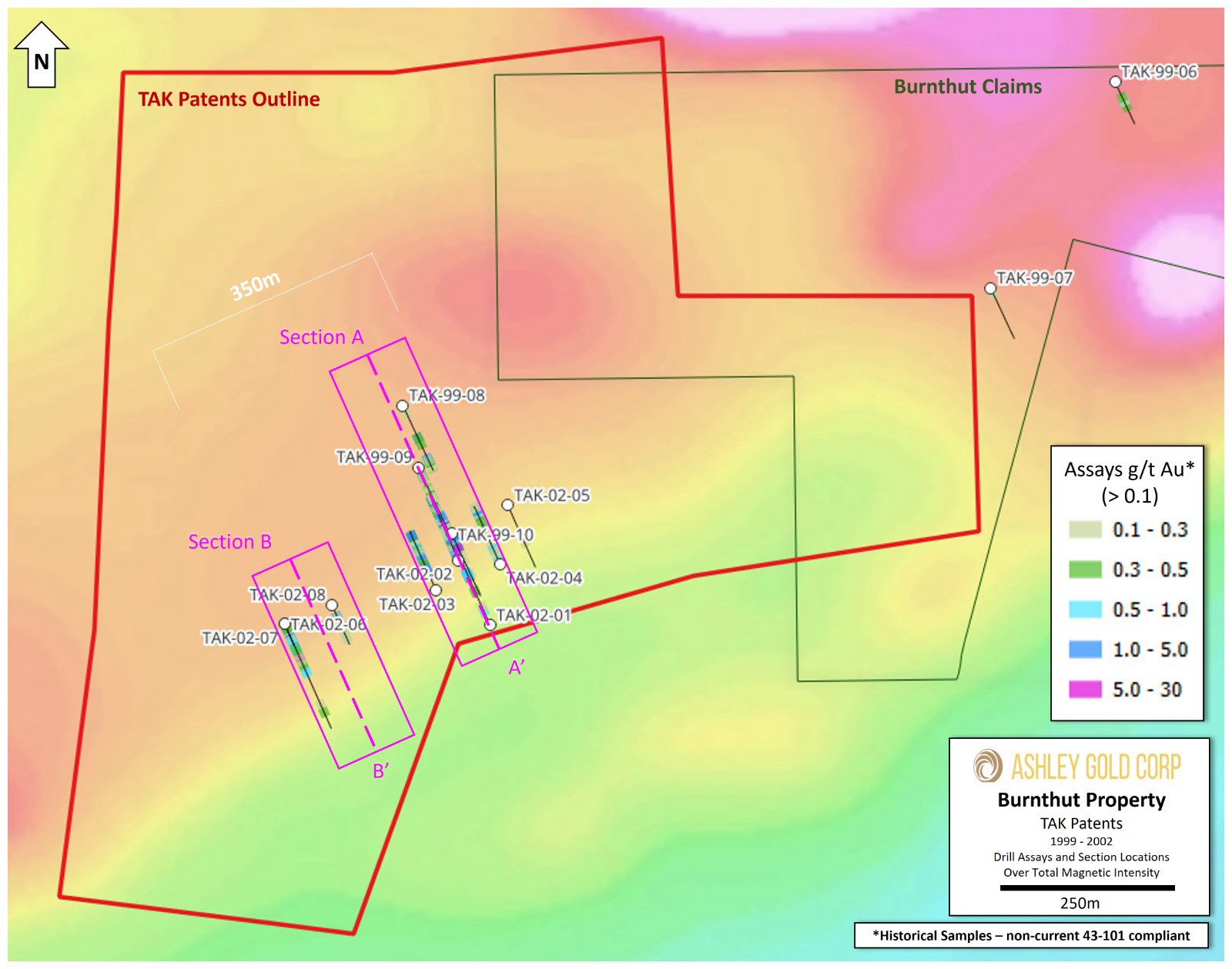 Tak Patents bring historical significance of a 1.5km mineralized corridor that hosts historic high grade and bulk tonnage gold values near surface