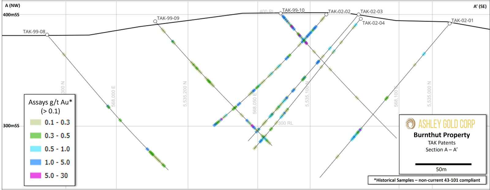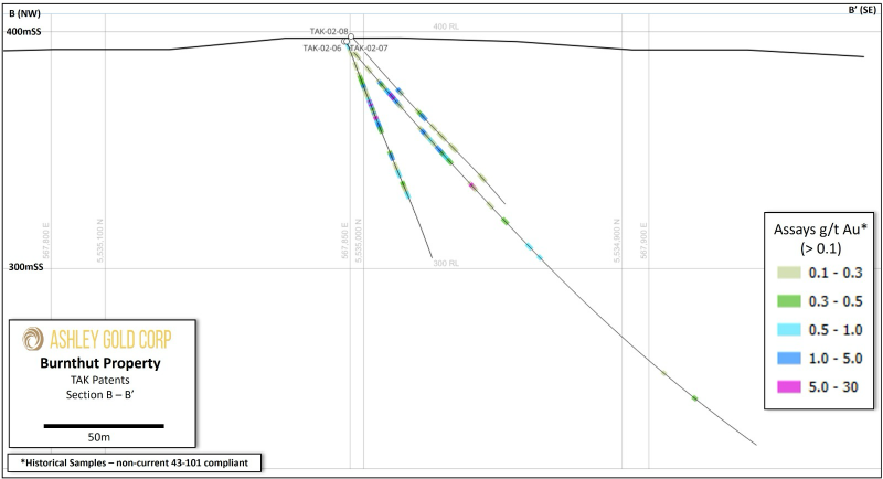Some results discussed in this document are historical. Ashley Gold Corp. nor the qualified person have performed sufficient work or data verification of the historical data. Although the historical results may not be reliable, the Company nevertheless believes that they provide an indication of the Project's potential and are relevant for any future exploration program.