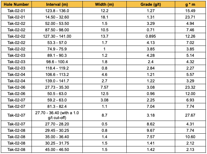 In 1999, Triex Resources drilled 3 holes (all @ 155 degrees) along Line 59 W on the Tak Grid targeting potential down dip extensions of gold values identified in surface trenching. All three holes returned gold values. The highlight of the campaign was Tak-99-10, which included 2.082 g/t Au over 31.83 m from 3.57-35.40 m, including 11.778 g/t Au over 2.88 from 25.5-25.38 m and 7.632 g/t Au over 1.10 m from 34.3-35.4 m.