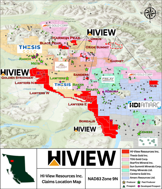 Hi-View Resources Inc. is a Canadian mineral exploration company focused on gold, silver, and copper assets in the Toodoggone region of British Columbia. Spanning over 26,000 hectares, its properties include the fully permitted Golden Stranger Project, Lawyers East, West, and North, Borealis, and Northern Claims (Black Pearl, Ursus, Oxide Summit, Garnet, Saunders, Harmon Peak, and Nub, are currently under option). The Golden Stranger Project, with 45 drill-ready sites, has yielded historical intercepts of 10 meters at 11.55 g/t gold, samples up to 111.5 g/t gold and 2,740 g/t silver, and new mineralized zones 1.3 km from the main showings, underscoring significant exploration potential. For more information, please visit Hi-View’s website or review the Company’s filings on SEDAR+ (www.sedarplus.ca).