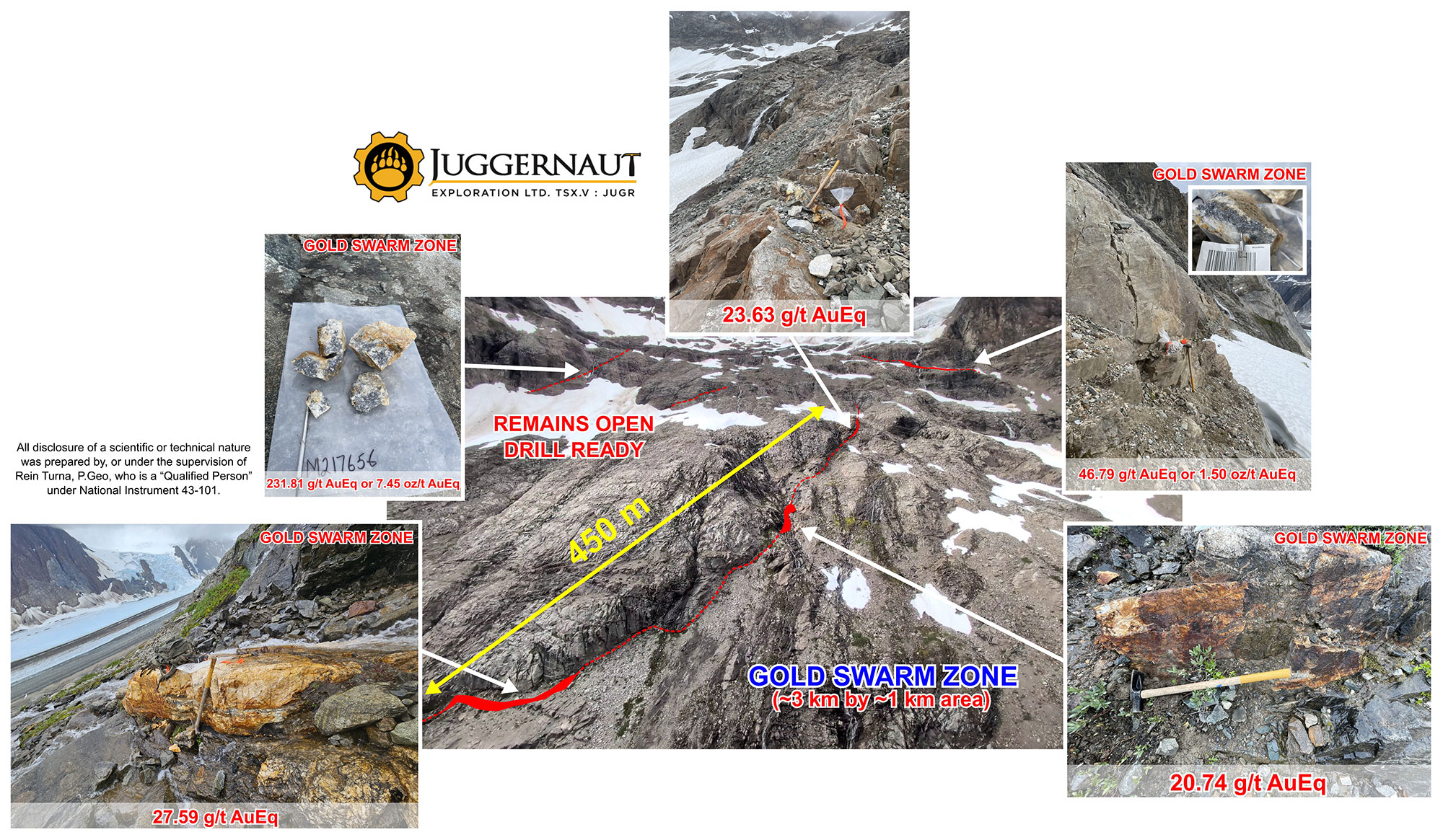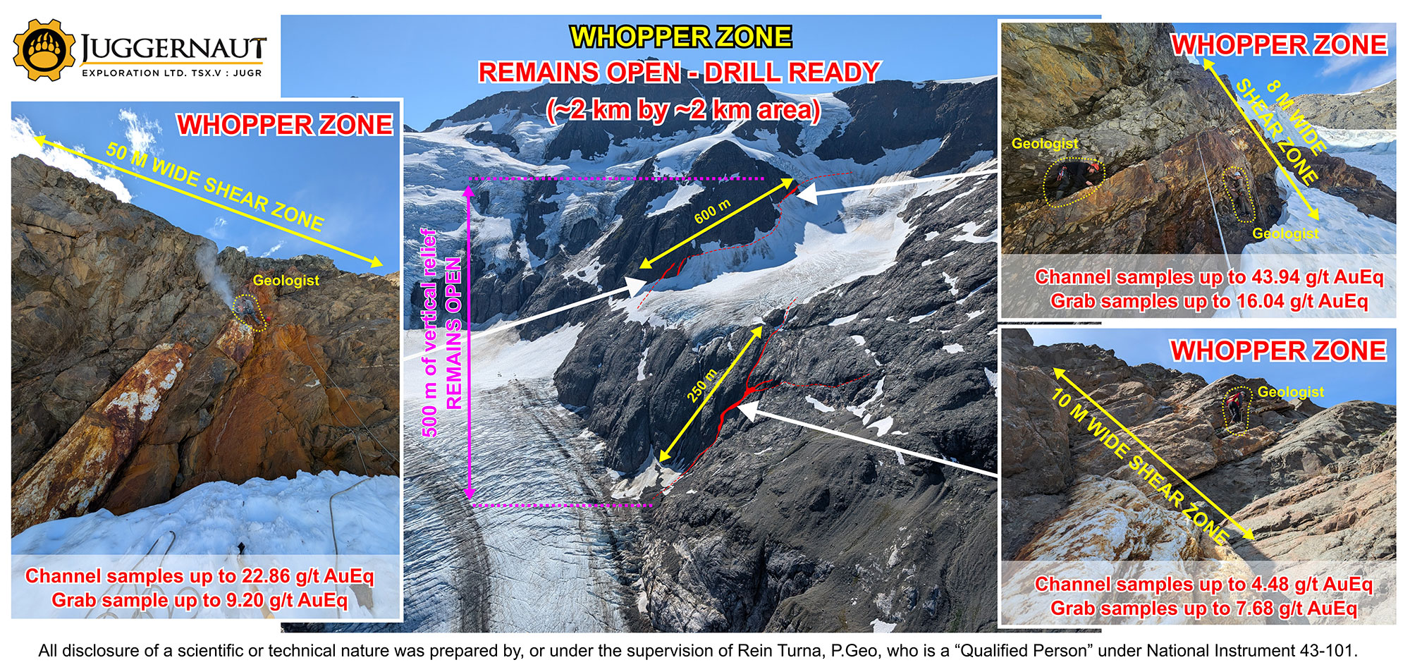 Vancouver, British Columbia – TheNewswire - November 10, 2025 – Juggernaut Exploration Ltd (JUGR.V) (OTCPK: JUGRF) (FSE: 4JE) (the “Company” or “Juggernaut”) is excited to announce that detailed mapping and sampling have confirmed that the gold-rich Big Mac Zone, Whopper Zone and Gold Dome Zone all form part of the 22 Km2 district-scale Eldorado System that remains wide open where grab samples assayed up to 263.70 g/t AuEq or 8.48 oz/t AuEq and channel cuts assayed up to 4.89 g/t AuEq over 5.21 m from >400 mineralized veins that are up to 10 m wide hosted in shear zones up to 50 m wide, and are exposed on surface for >1 km with >1 km of vertical relief, remains open and is drill ready on the Big One property (the “Property”), Golden Triangle, British Columbia. In addition, based on excellent assay results, the Company has acquired additional claims and expanded the Gold Swarm discovery area of strong gold potential from 1 km2 to 3 km2 and 700 m of vertical relief and remains open, effectively tripling this area of strong gold potential, where grab samples assayed up to 231.81 g/t AuEq or 7.45 oz/t AuEq and channel cuts assayed up to 4.51 g/t AuEq over 4.36 m that remains open and is drill ready. The Big One discovery is located in an area of recent glacial and snowpack abatement adjacent to the Tier 1 gold-rich porphyry systems, the likes of Galore Creek. The 100% controlled Big One property covers 39,271 hectares of geological terrane with tremendous additional discovery potential.