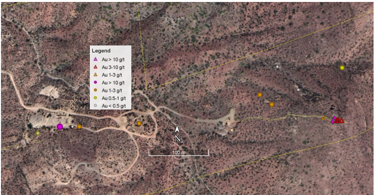 Figure 2. Map showing the Ripsey mine and Au assays. Triangle symbols indicate samples taken from underground workings.