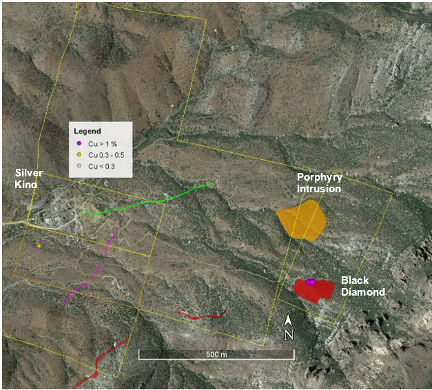 The mapping and sampling program at the Silver King project not only expanded the drill targets with the identification of two additional veins and zones of replacement mineralization but also identified a felsic intrusion with strong sericite alteration and moderate to strong stockwork of quartz-pyrite veins near the Black Diamond replacement body. This porphyry intrusion is exposed within an erosional window inside a widespread and less altered quartz diorite intrusion and may represent the upper portions of a porphyry system. This area was explored by Fischer-Watt Mining Co. in 1980 and 19811. Fischer-Watt geologists concluded that the strongly quartz-sericite-pyrite body was probably related to the upper parts of a porphyry system based on rock geochemistry showing copper, molybdenum and zinc anomalies centered on the body, the alteration assemblages present, and the presence of high salinity fluid inclusions in the stockwork quartz veins.