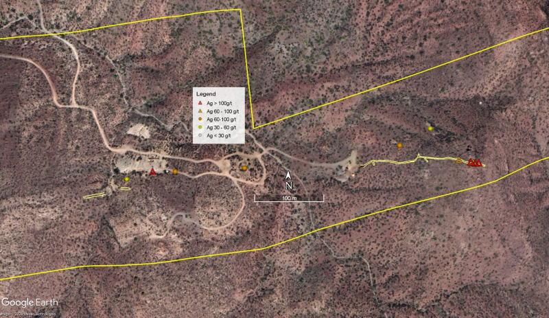 Samples from what appear to be the northward extension of the polymetallic vein east of the Silver King glory hole yielded 47 g/t Ag, 3.43 % Pb and 3.42 % Zn (Fig. 6). Also, an additional vein was identified in a small prospect about 100 meters southwest of the Silver King mine which returned anomalous values for silver and base metals.