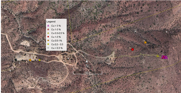 Figure 4. Map showing the Ripsey mine and Cu assays. Triangle symbols indicate samples taken from underground workings.