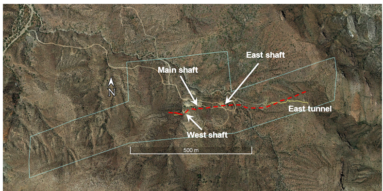 Figure 1. Map showing the location of the Ripsey mine workings, claim boundary in light blue, and the Ripsey vein in red, now explored for about 600 meters along strike.