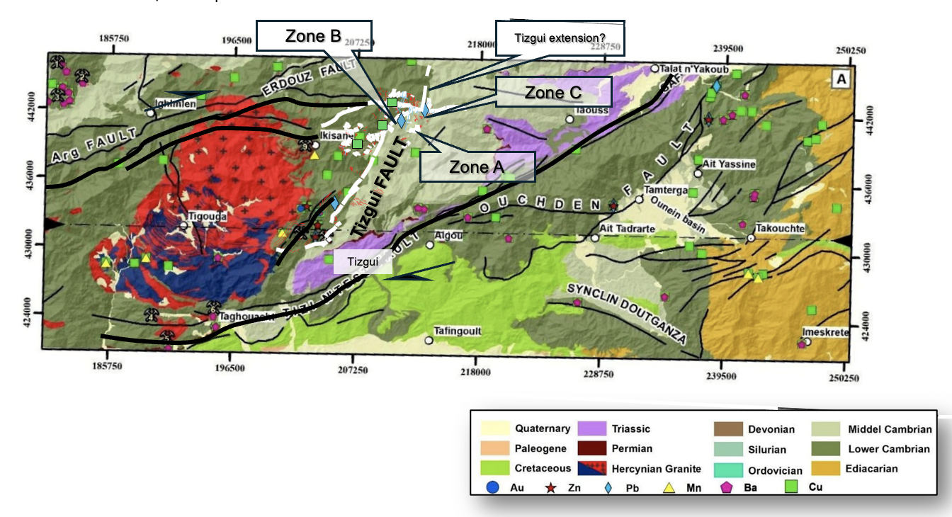 On a regional scale Zone B represented a significant structural intersection, between the Tizgui and Arg-Erdouz faults which created a Y-shaped trap that focussed gold-bearing hydrothermal fluids. This setting, linked to deep structures around the Tichka granite, generated intense fracturing and the deposition of high-grade gold veins in favourable carbonate and diorite hosts. In essence, Structure B exhibited as an exceptional structural trap site for gold mineralisation.