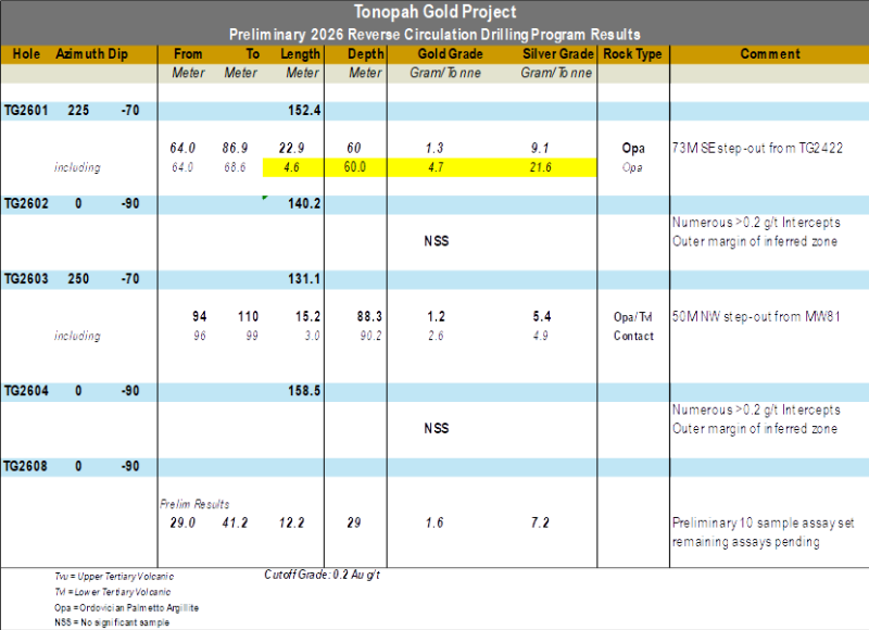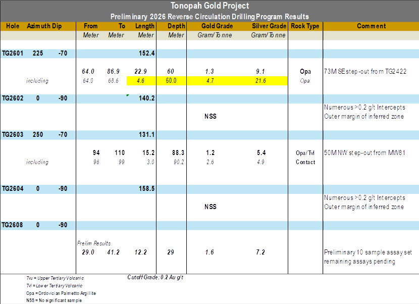VANCOUVER, BC – TheNewswire - April 23, 2026 – Viva Gold Corp (TSXV: VAU; OTCQB: VAUCF) (the “Company” or “Viva”) is pleased to announce initial results from its 2026 reverse-circulation (“RC”) drill program, along with an update on pre-feasibility and baseline study activities at its Tonopah Gold Project (“Tonopah,” or the “Project”) in Nevada. Tonopah is 100%-owned by Viva and is located on the prolific Walker Lane Mineral Trend in western Nevada, approximately a 30-minute drive south of Kinross Gold’s Round Mountain Mine. Initial drill results have identified new areas of near surface, higher-grade mineralization, with additional assay results pending.
